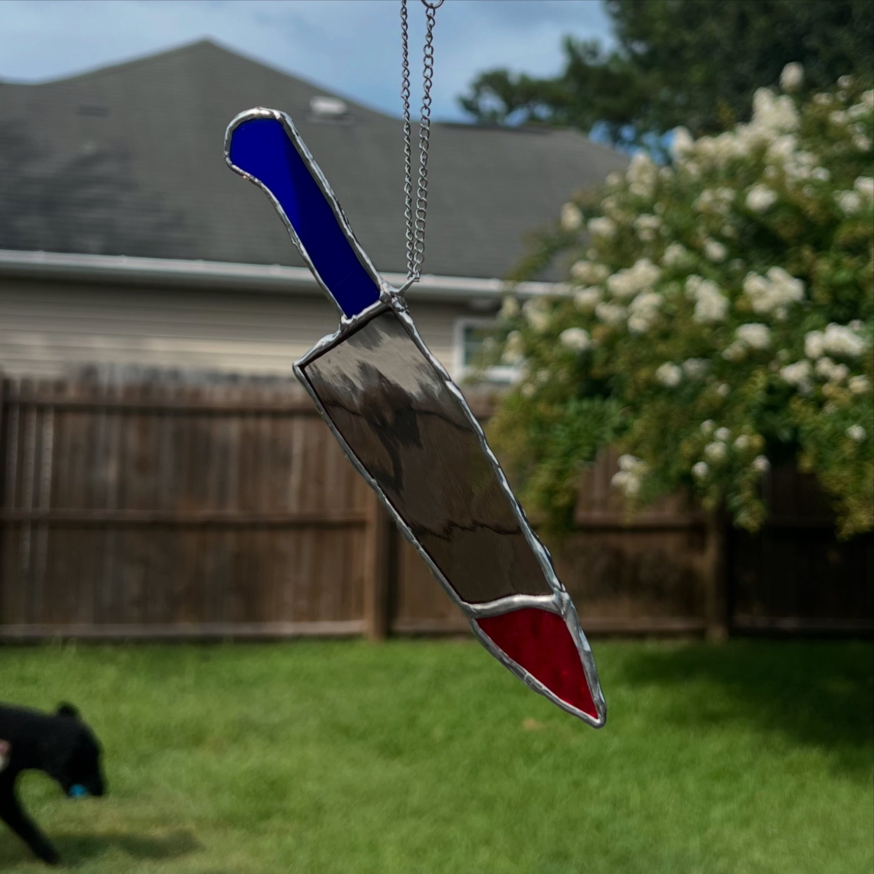 This handmade stained glass knife measures approximately 4”x1”. Each piece is carefully crafted using traditional techniques, making every one unique with slight variations in glass texture and color. Perfect for adding a touch of artisan charm to any window, wall, or space.