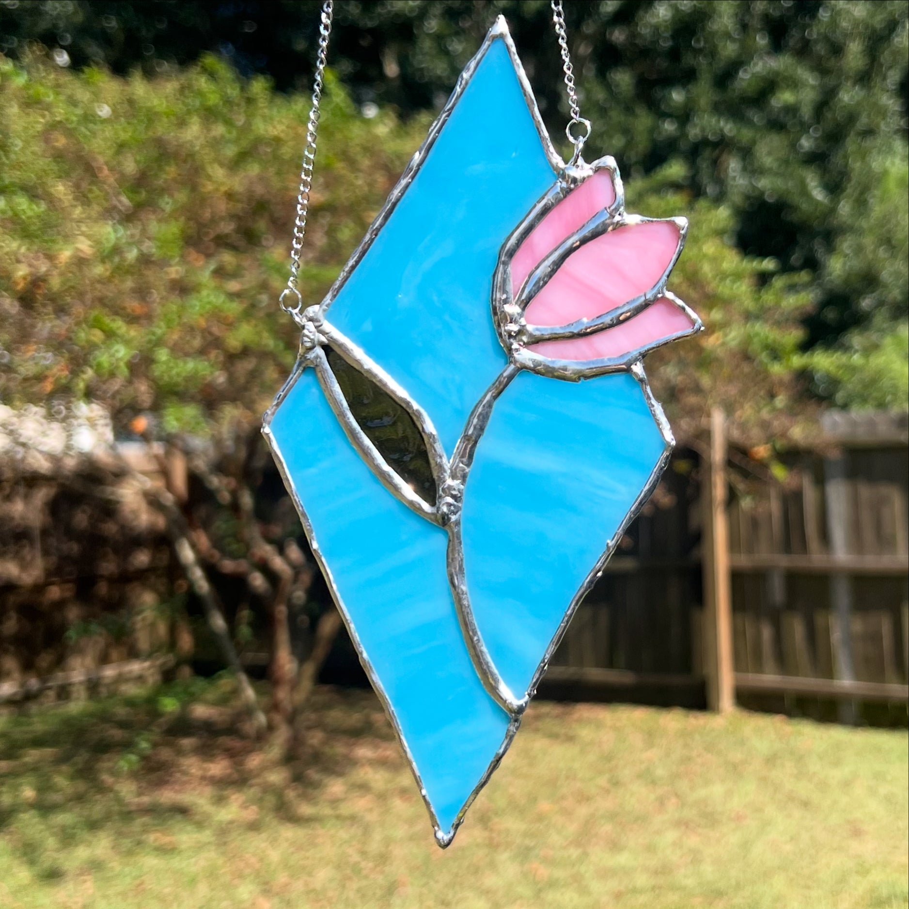 This handmade stained glass tulip diamond panel measures approximately 7”x4”. Each piece is carefully crafted using traditional techniques, making every one unique with slight variations in glass texture and color. Perfect for adding a touch of artisan charm to any window, wall, or space.