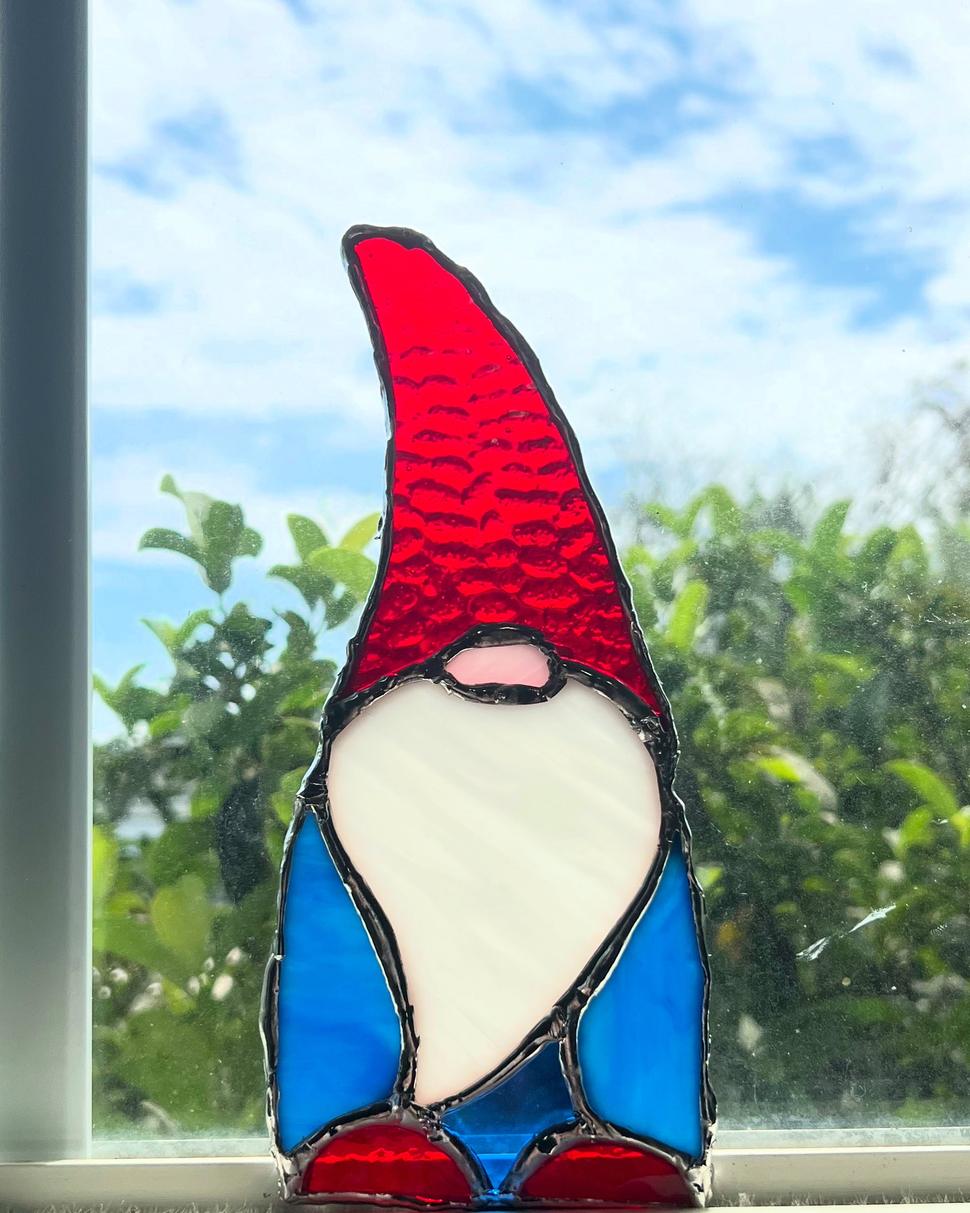 This handmade stained glass gnome measures approximately 8”x3”. Each piece is carefully crafted using traditional techniques, making every one unique with slight variations in glass texture and color. Perfect for adding a touch of artisan charm to any window, wall, or space.