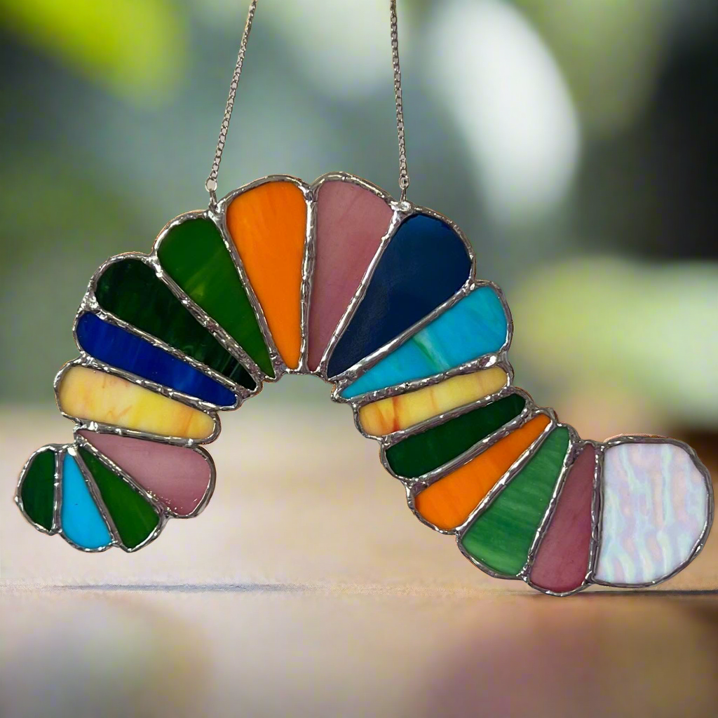 This handmade stained glass caterpillar measures approximately 12”x6”. Each piece is carefully crafted using traditional techniques, making every one unique with slight variations in glass texture and color. Perfect for adding a touch of artisan charm to any window, wall, or space.