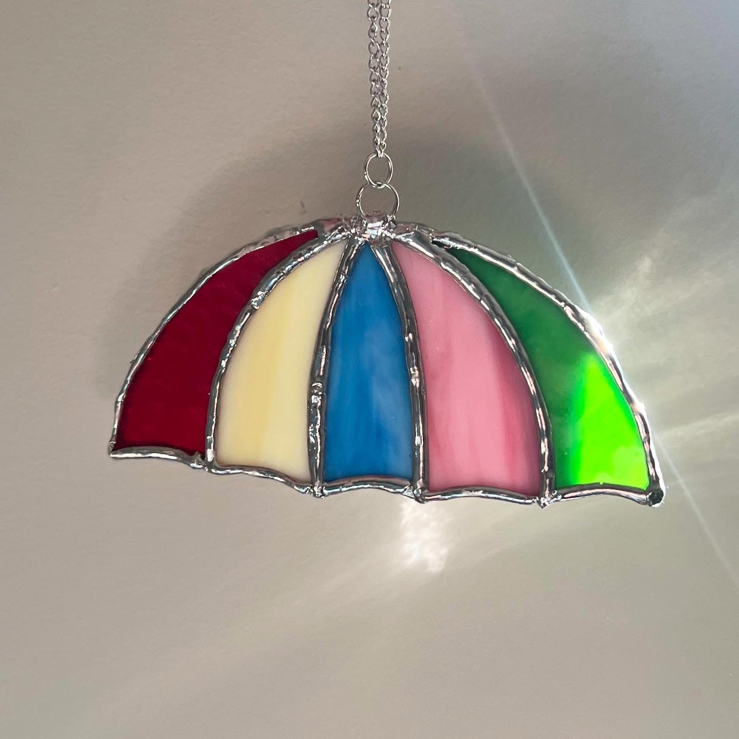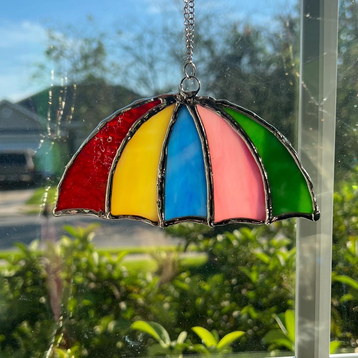This handmade stained glass umbrella measures approximately 6”x3”. Each piece is carefully crafted using traditional techniques, making every one unique with slight variations in glass texture and color. Perfect for adding a touch of artisan charm to any window, wall, or space.