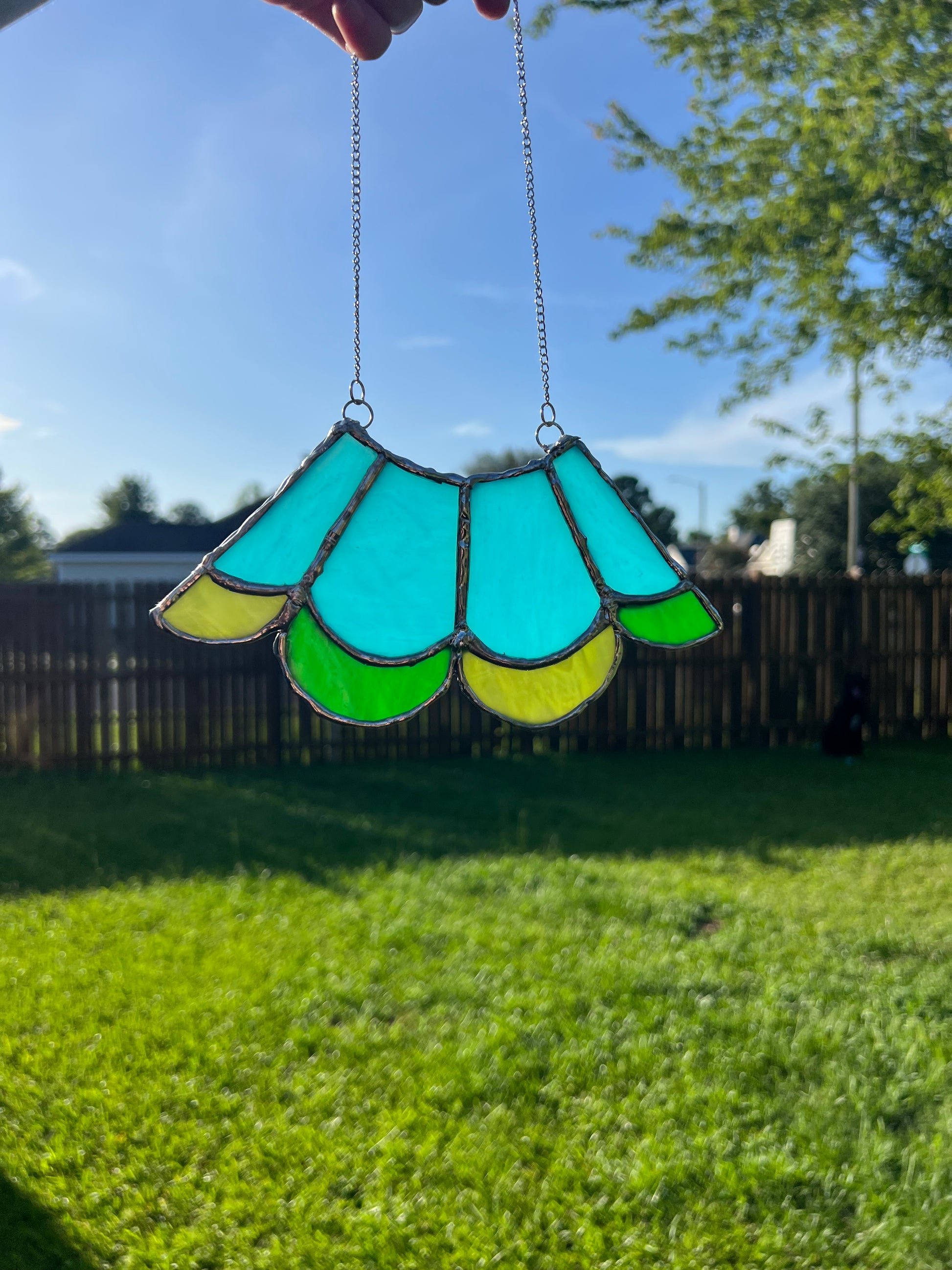 This handmade stained glass scalloped panel measures approximately 8”x4”.Each piece is carefully crafted using traditional techniques, making every one unique with slight variations in glass texture and color. Perfect for adding a touch of artisan charm to any window, wall, or space.