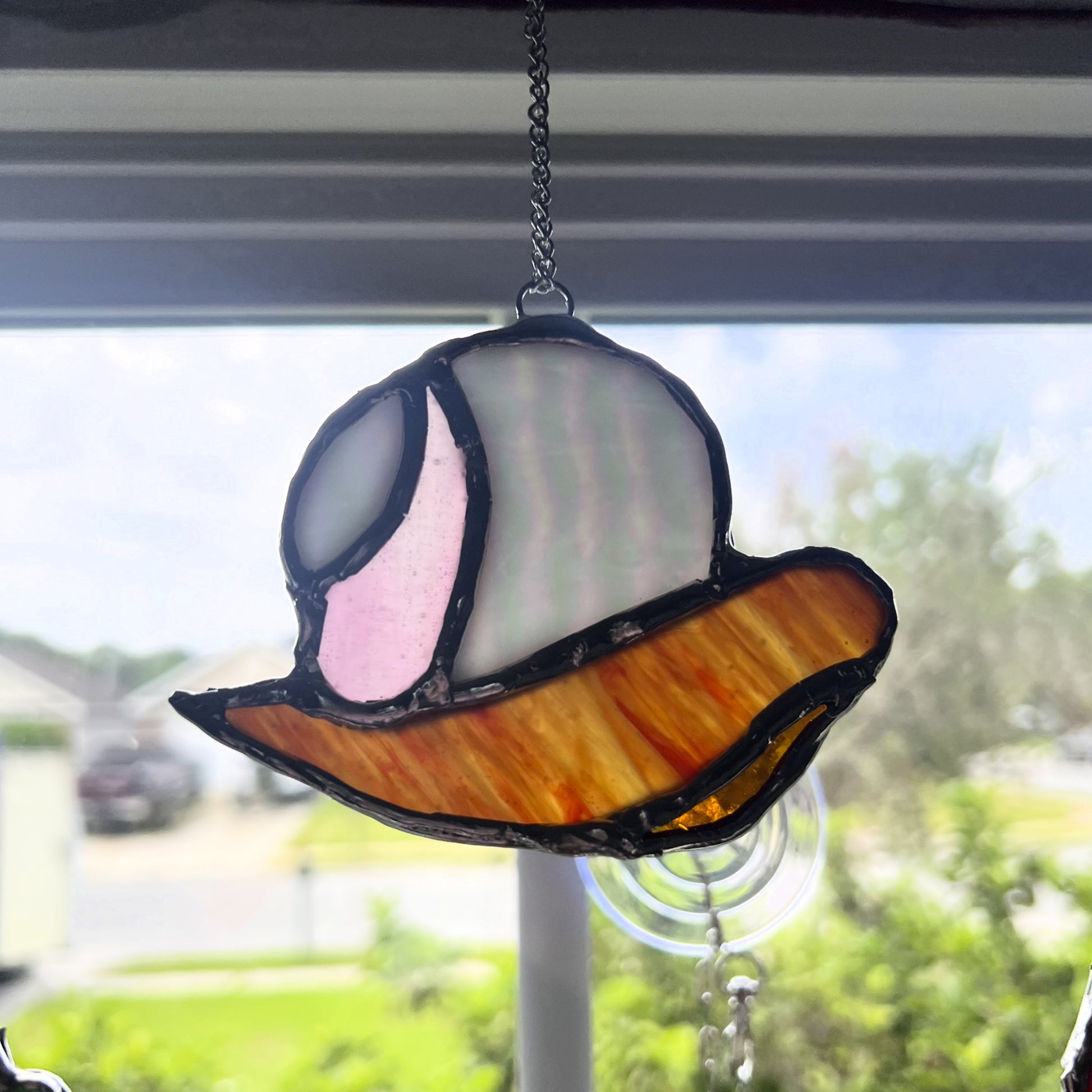 This handmade stained glass snail measures approximately 5”x3”. Each piece is carefully crafted using traditional techniques, making every one unique with slight variations in glass texture and color. Perfect for adding a touch of artisan charm to any window, wall, or space.